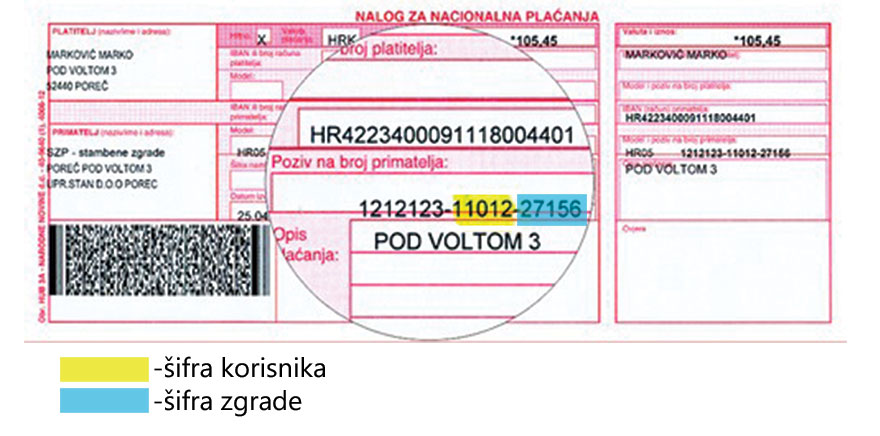 Korak 2. – unijeti šifru korisnika i šifru zgrade u pripadajuća polja (podatke možete pronaći na Vašoj uplatnici za pričuvu - vidi sliku).